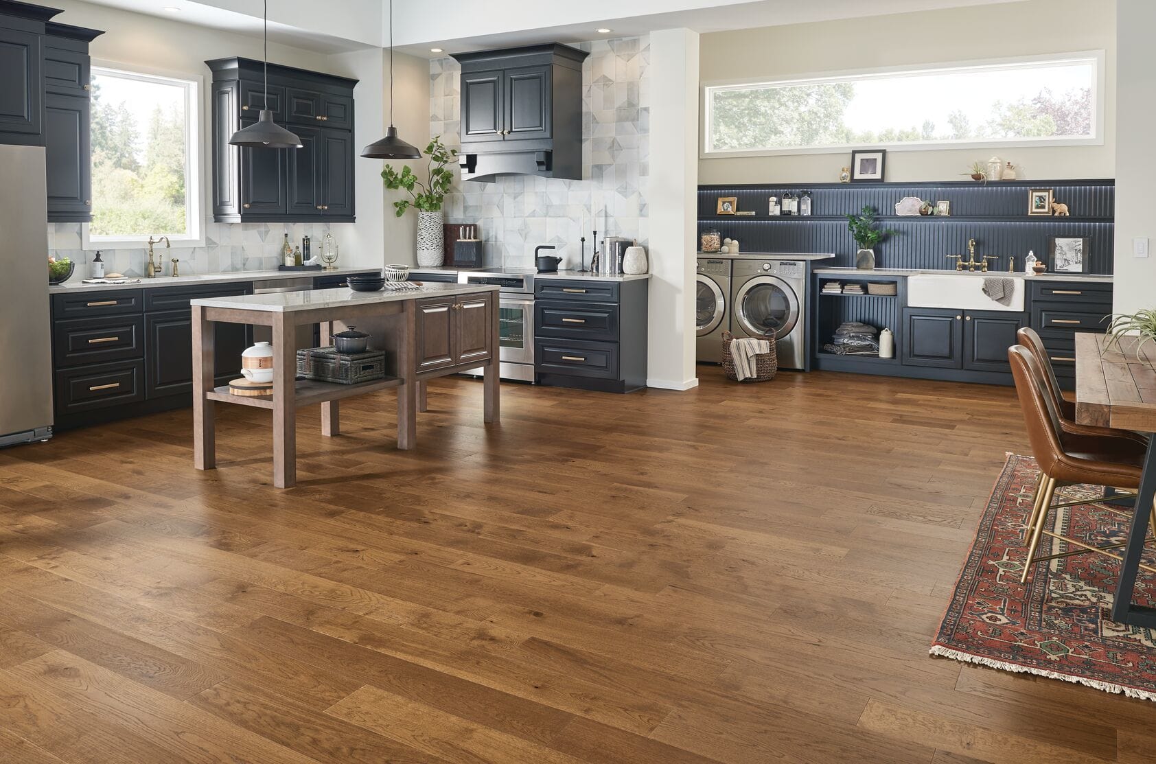 Kitchens, bathrooms and basements are no problem. Install this engineered wood flooring in any room and on any level.